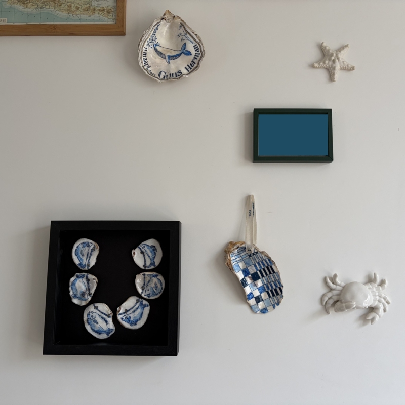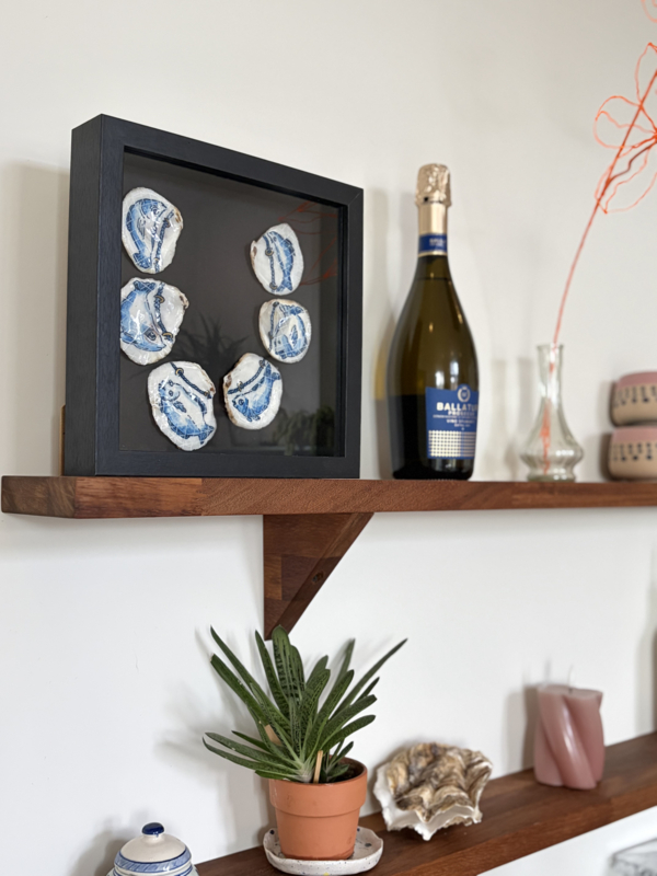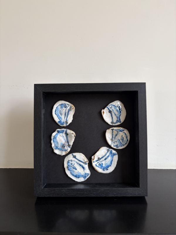 Een uniek collier stuk wat bestaad uit 6 platte oesters. Elk een onderdeel van het geheel. De lijst die we hiervoor gebruiken is zwart met een houten lijst, springt het direct in het oog. Voorzien van Museumglas. Slechts één van gemaakt.